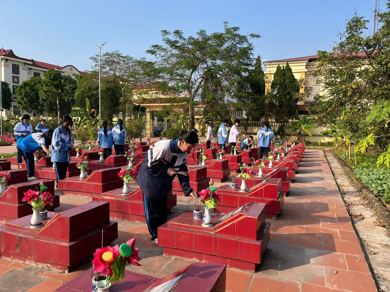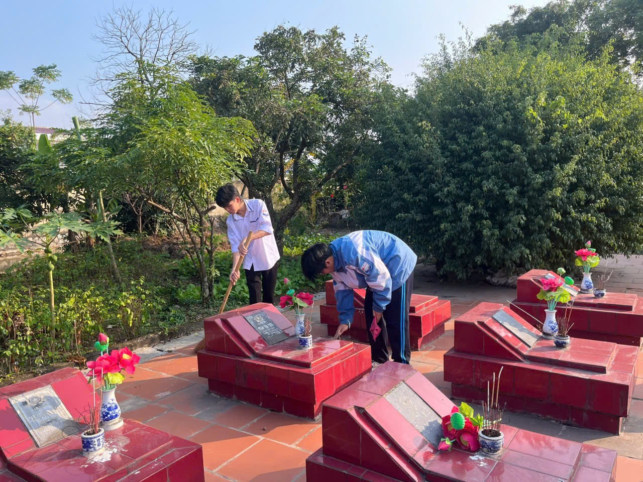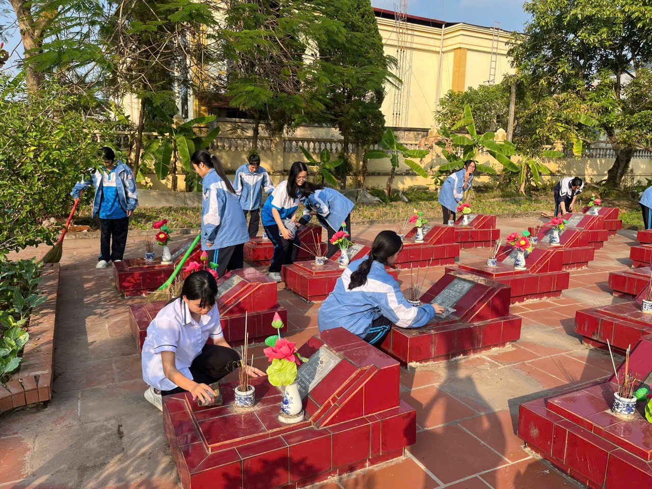Sau nghi thức dâng hương, các đoàn viên, thanh niên đã cùng nhau vệ sinh, dọn dẹp toàn bộ khuôn viên nghĩa trang. Từng phần mộ được lau chùi cẩn thận, từng lối đi được quét dọn sạch sẽ. Đây là những hành động thiết thực, thể hiện đạo lý "Uống nước nhớ nguồn" và trách nhiệm của thế hệ trẻ trong việc chăm sóc, gìn giữ nơi an nghỉ của các anh hùng liệt sĩ.