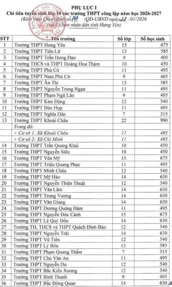 THÔNG BÁO CHỈ TIÊU TUYỂN SINH VÀO LỚP 10 NĂM HỌC 2026 - 2027