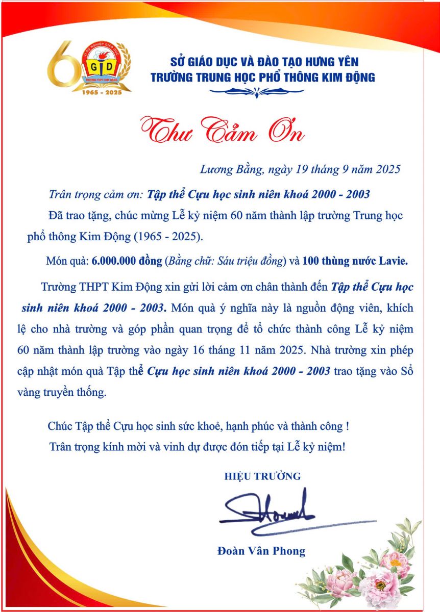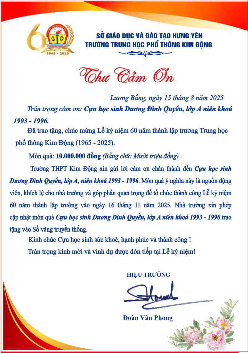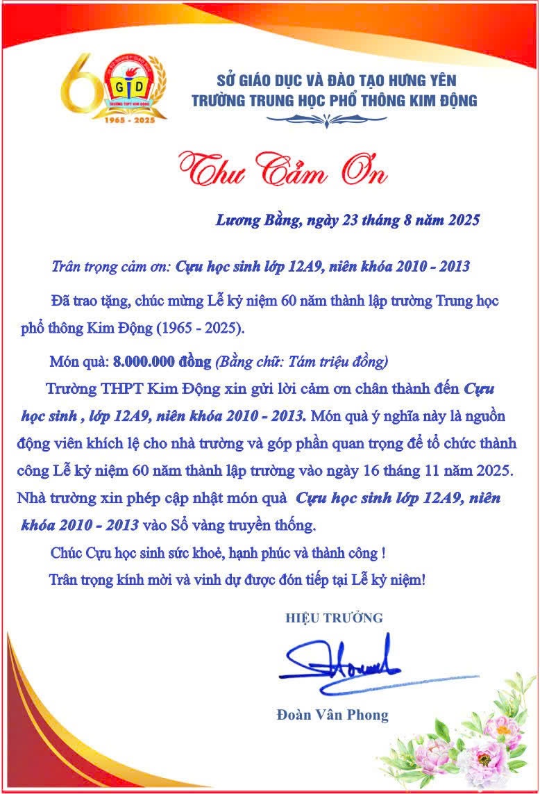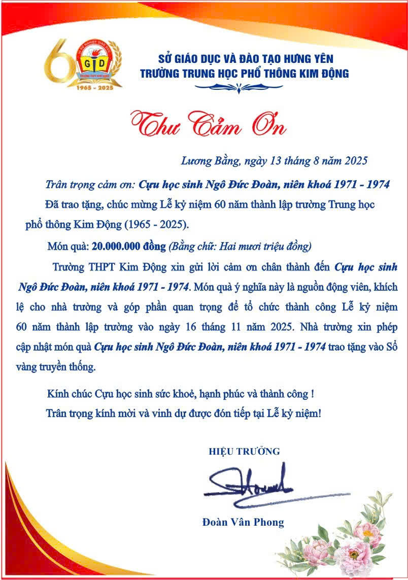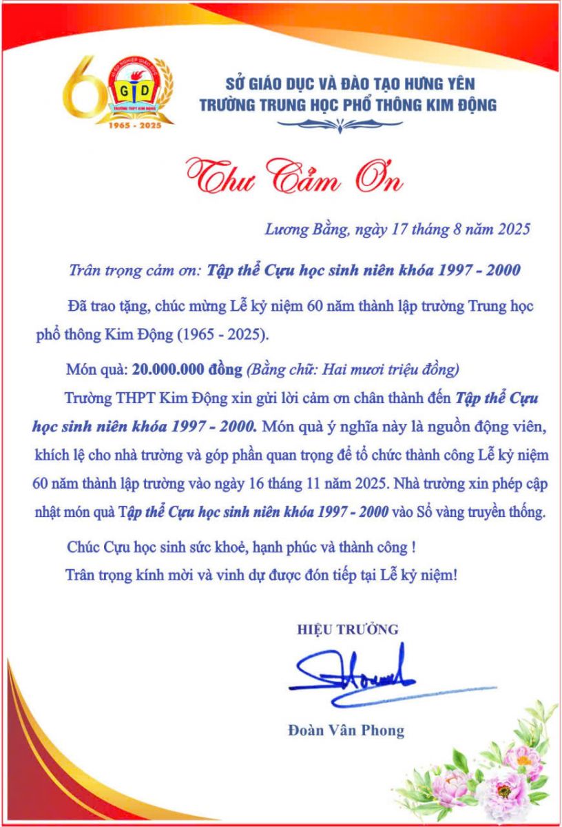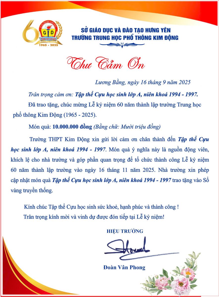 THƯ NGỎ VIẾT BÀI ĐĂNG TẬP SAN KỶ NIỆM 60 NĂM THÀNH LẬP TRƯỜNG THPT KIM ĐỘNG (1965 - 2025)(16/06/2025)