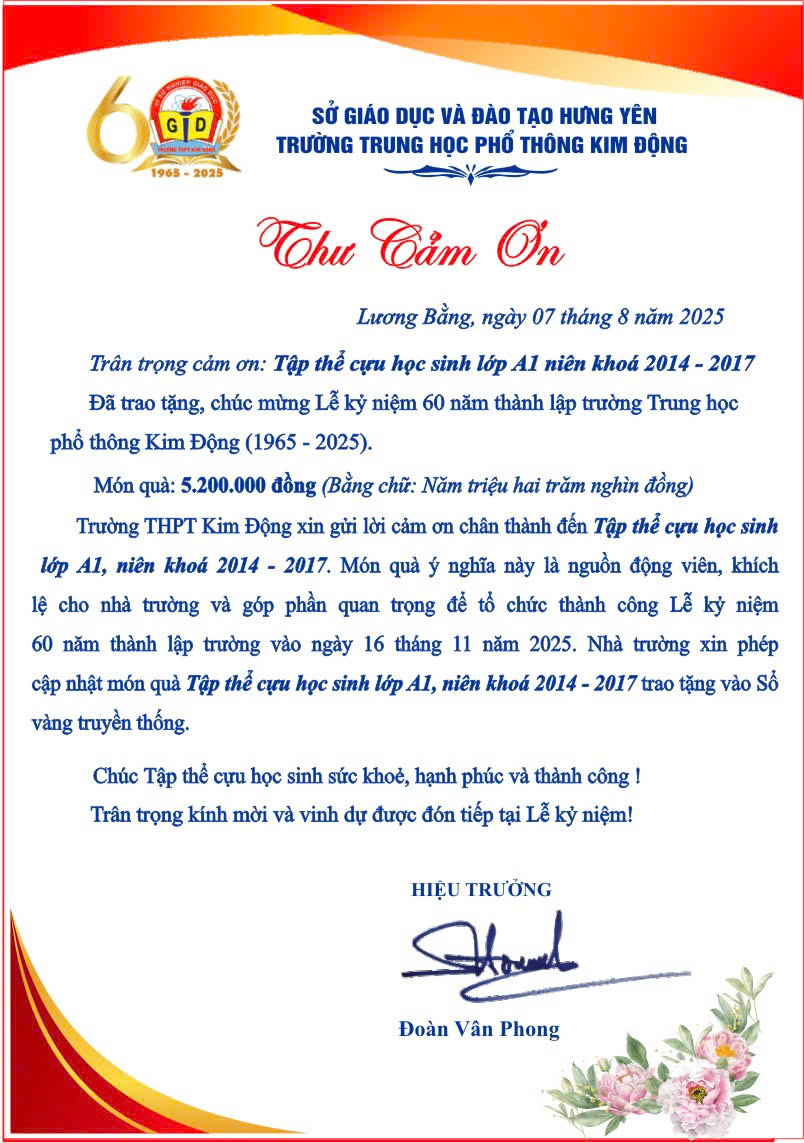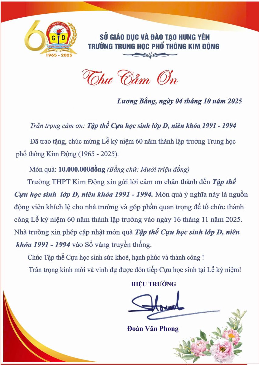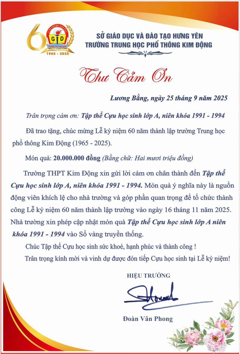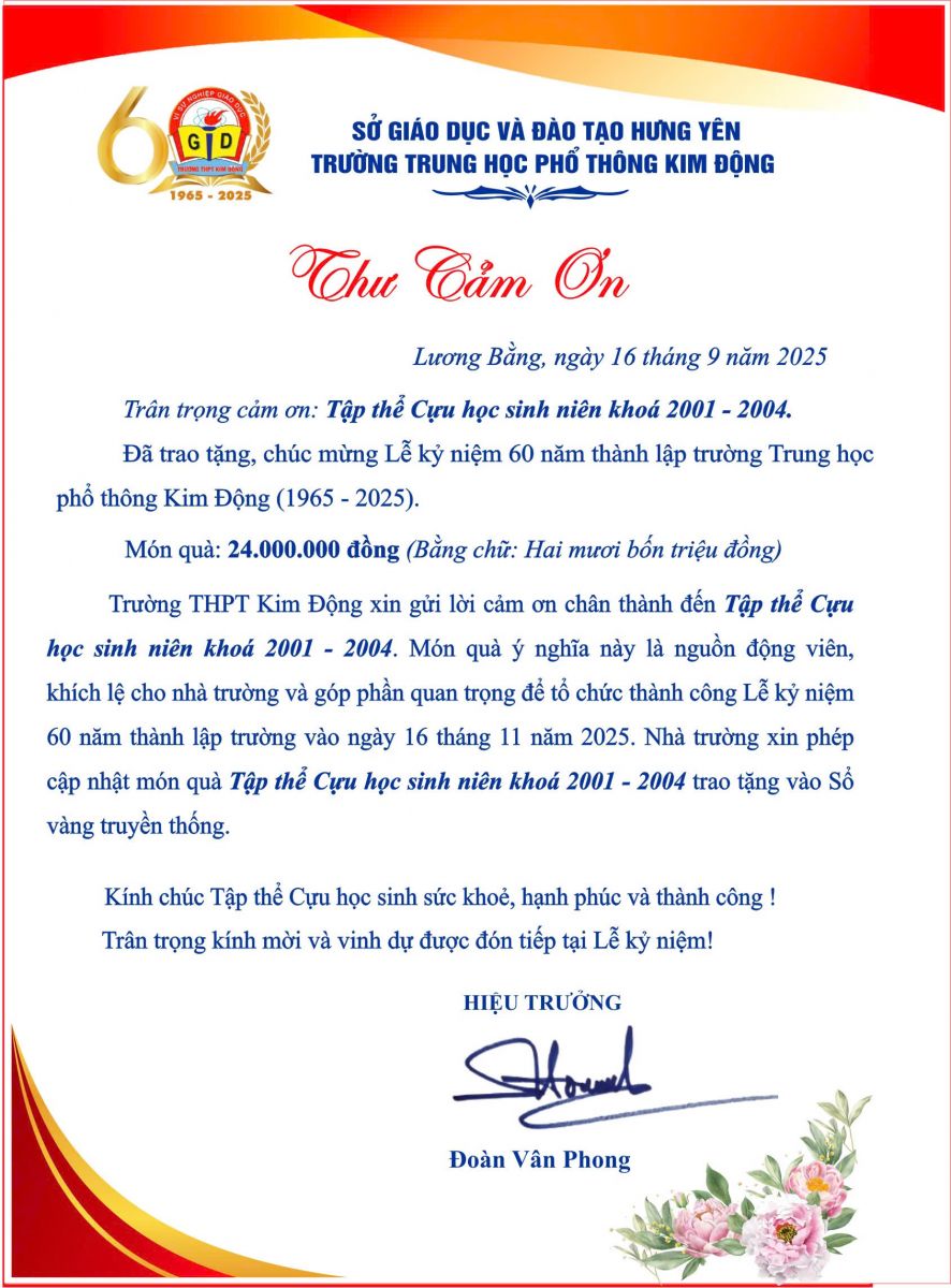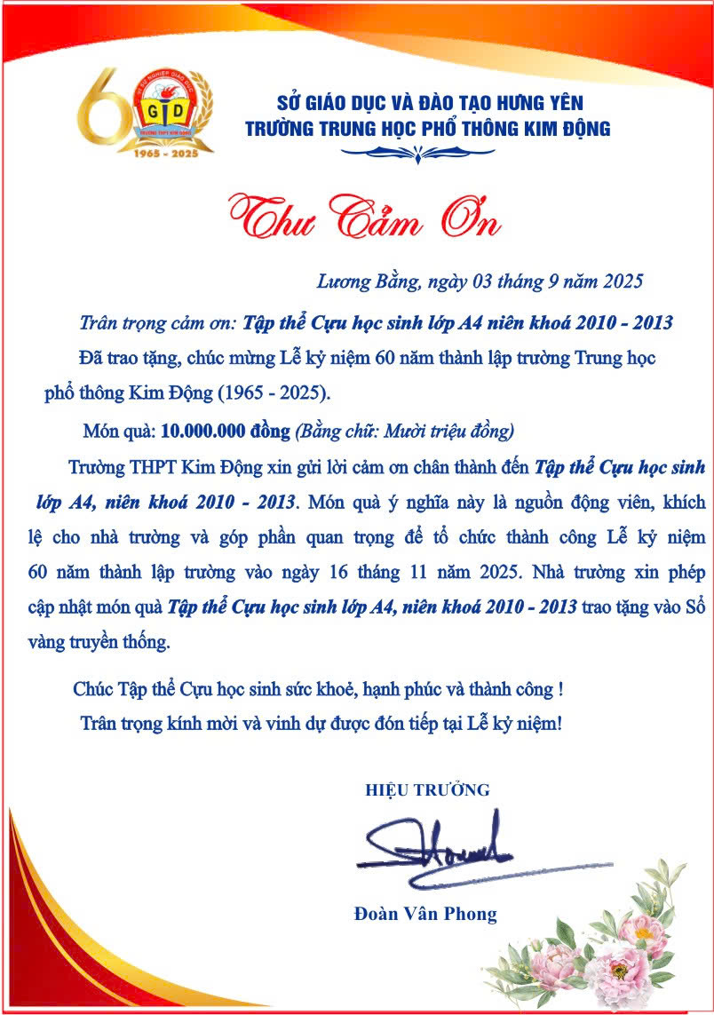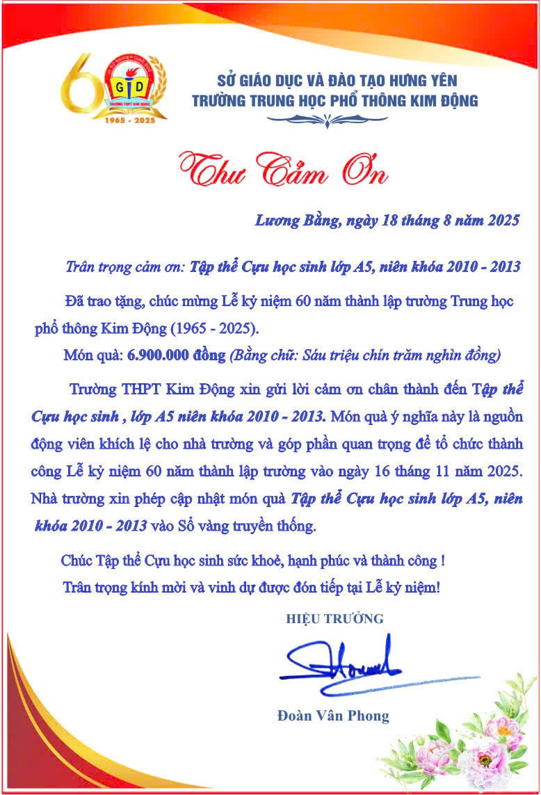 THƯ NGỎ VIẾT BÀI ĐĂNG TẬP SAN KỶ NIỆM 60 NĂM THÀNH LẬP TRƯỜNG THPT KIM ĐỘNG (1965 - 2025)(16/06/2025)