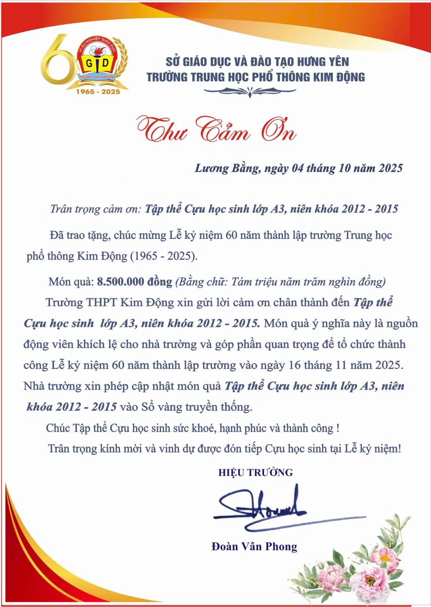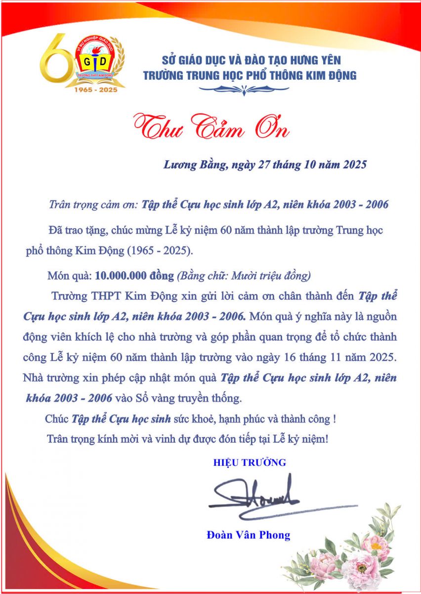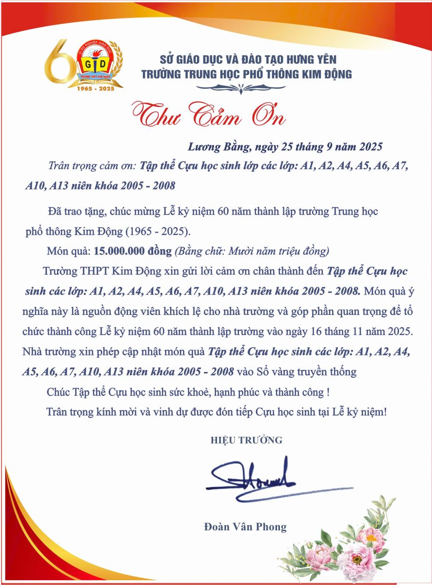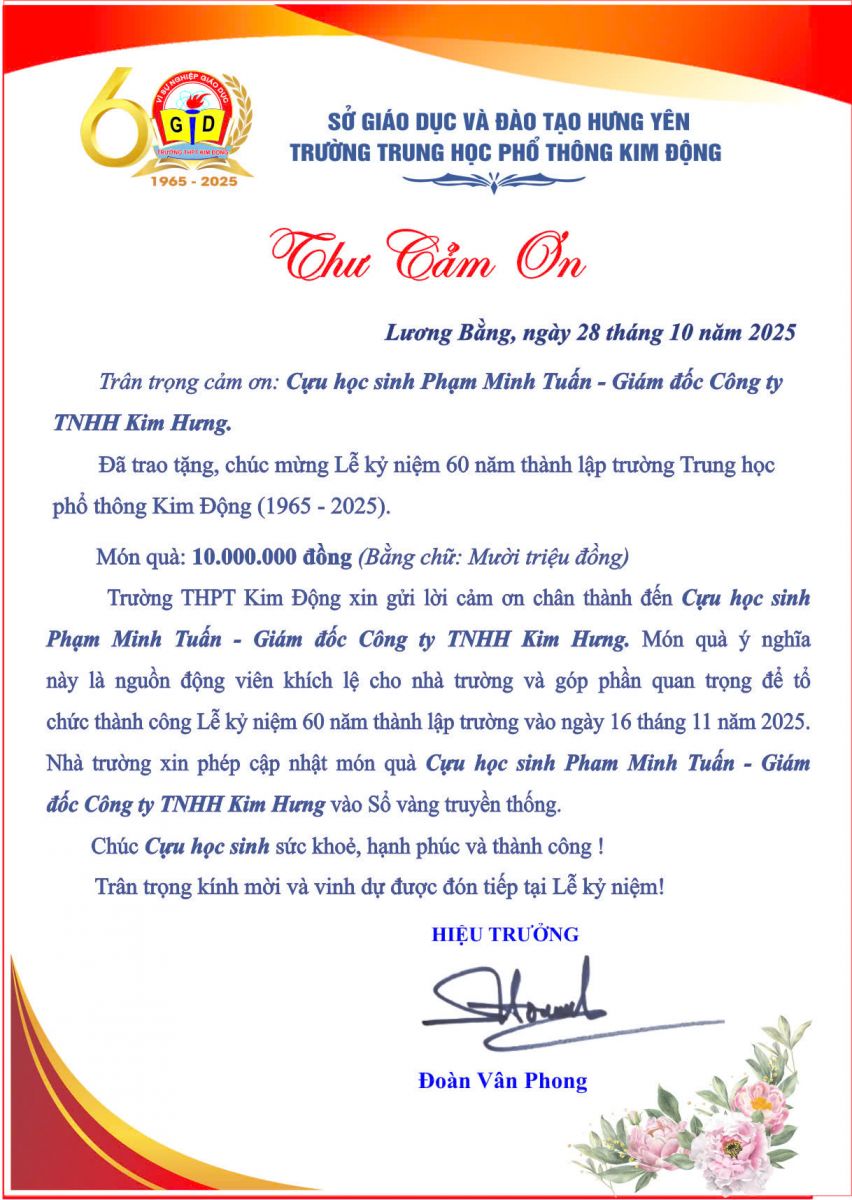 GIẤY MỜI KỶ NIỆM 60 NĂM THÀNH LẬP TRƯỜNG THPT KIM ĐỘNG(26/10/2025)