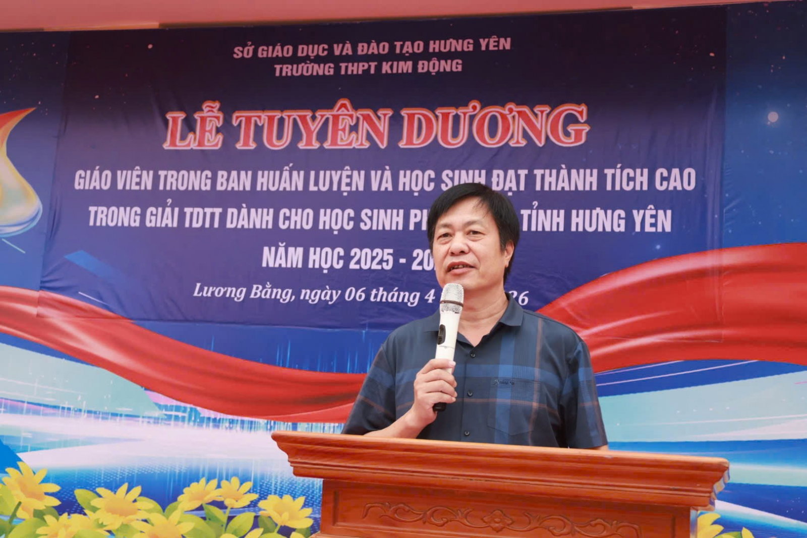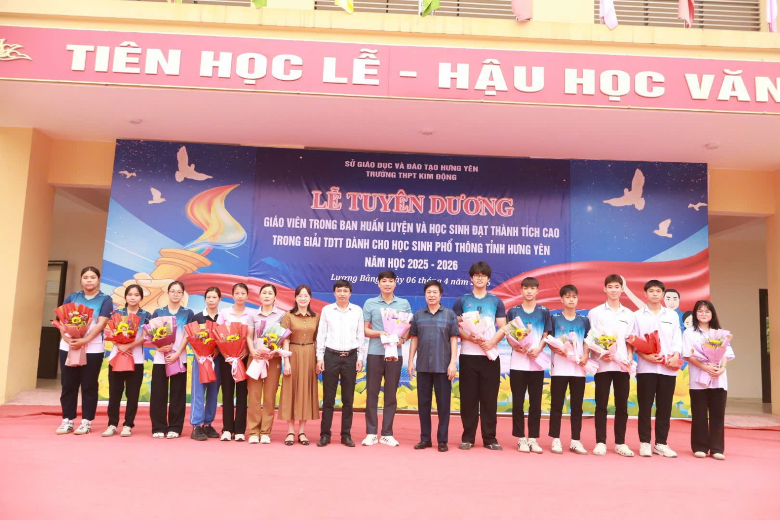 Trong không khí trang nghiêm và rực rỡ dưới nắng sớm của buổi sinh hoạt dưới cờ sáng nay, thứ Hai ngày 6/4/2026, Trường THPT Kim Động đã long trọng tổ chức Lễ tuyên dương giáo viên trong Ban Huấn luyện và học sinh đạt thành tích cao tại Giải TDTT dành cho học sinh phổ thông tỉnh Hưng Yên năm học 2025 - 2026. Đây là dịp để nhà trường ghi nhận những nỗ lực bền bỉ và tôn vinh những gương mặt ưu tú đã mang vinh quang về cho mái trường giàu truyền thống.
